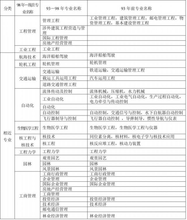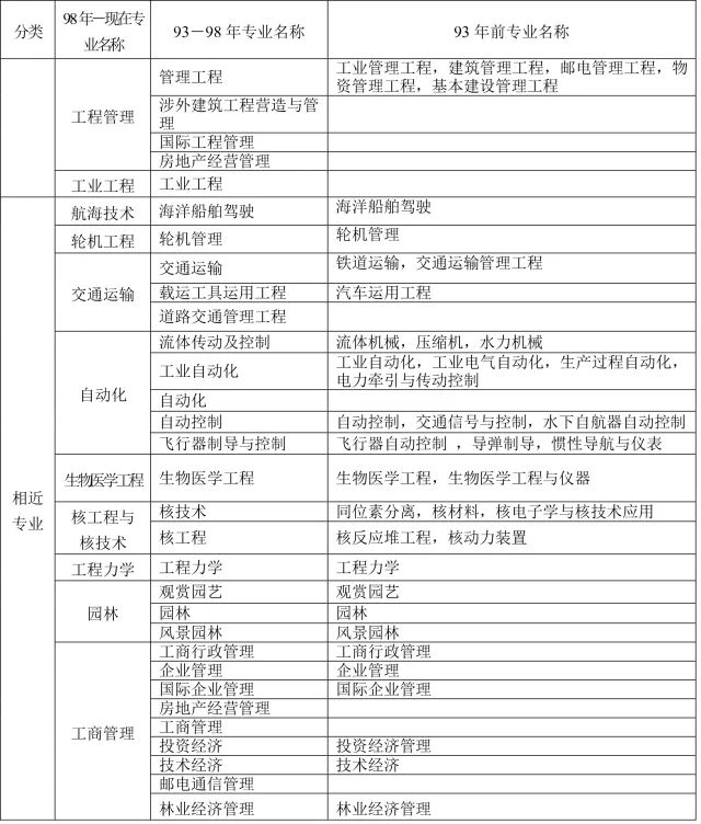 3、 為便于考核認定條件中有關專業(yè)學歷的確認,對“本專業(yè)”、“相近專業(yè)”和“其他專業(yè)”進行了劃分,供申報和審核考核認定條件時參考。其他專業(yè)的具體范圍由建設部、人事部確認。