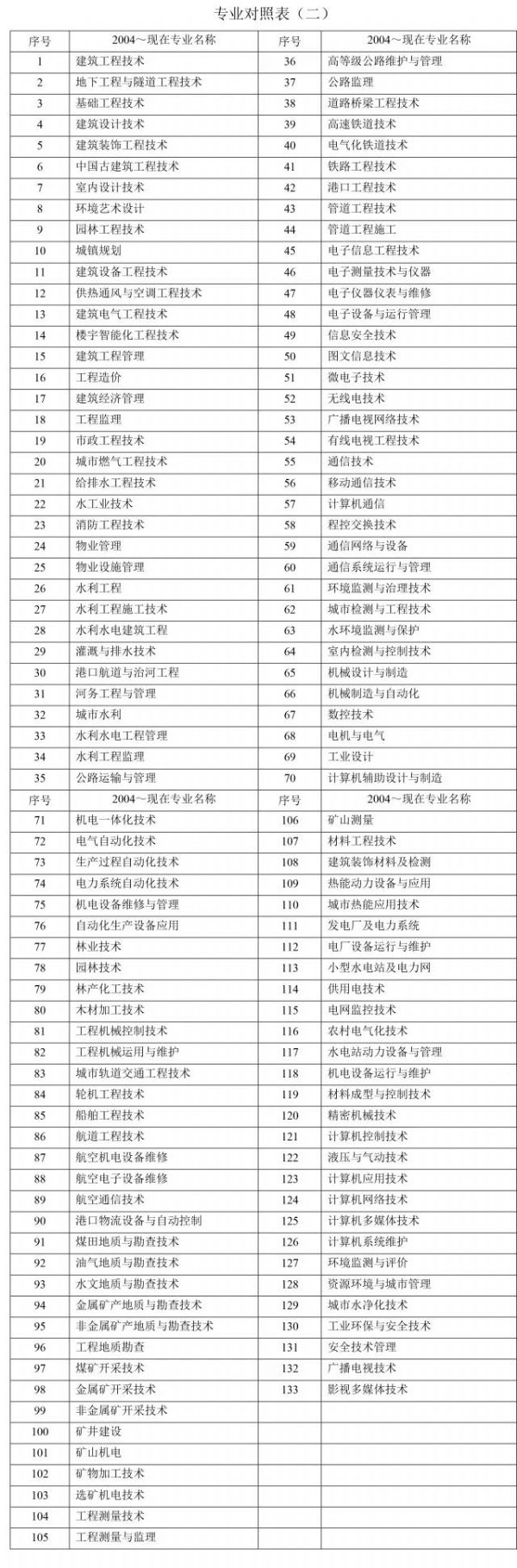 注:本表按教育部現(xiàn)行《普通高等學校高職高專教育指導性專業(yè)目錄(2005年版)》編制。共涉及“土建施工類、工程管理類、建筑設計類、城鎮(zhèn)規(guī)劃與管理類、建筑設備類、市政工程類、房地產(chǎn)類、水利工程與管理類、機械設計制造類、自動化類、電子信息類、通訊類、環(huán)保類、機電設備類、公路運輸類、鐵路運輸類、港口運輸類、管道運輸類、林業(yè)技術類、城市軌道運輸類、水上運輸類、民用運輸類、資源勘查類、水利水電設備類、地質工程與技術類、礦冶工程類、礦物加工類、測繪類、材料類、能源類、電力技術、計算機類、安全類、廣播影視類”等34類133個專業(yè),其中本專業(yè)76個,相近專業(yè)57個。