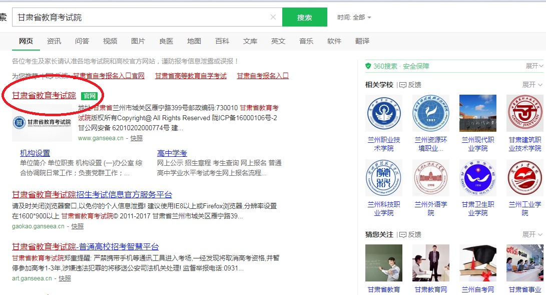 二、新冠肺炎確診病例、無(wú)癥狀感染者、疑似患者、確診病例密切接觸者等“四類(lèi)人員”不得參加考試。三、考生進(jìn)入考點(diǎn)、考場(chǎng)時(shí)不得因?yàn)榕宕骺谡钟绊懮矸葑R(shí)別?荚嚻陂g,考生自備口罩。考生在進(jìn)入考場(chǎng)前必須佩戴口罩,進(jìn)入考場(chǎng)后建議考生全程佩戴口罩。隔離考場(chǎng)的考生必須全程佩戴口罩。四、考試期間,考生必須嚴(yán)格遵守《2020年甘肅省成人高考防疫工作方案》要求和成人高考相關(guān)規(guī)定,完全服從考點(diǎn)工作人員安排。五、10月21日起,考生登錄甘肅省教育考試院網(wǎng)站自行打印準(zhǔn)考證(具體打印流程見(jiàn)第八條)。同時(shí)打印《2020年甘肅省成人高考考生安全考試承諾書(shū)及身體健康狀況監(jiān)測(cè)表》(見(jiàn)附件2),并簽字確認(rèn),于第一場(chǎng)考試時(shí)交監(jiān)考人員。六、考生不得提供身體健康狀況虛假信息。對(duì)于隱瞞行程、隱瞞病情、故意壓制癥狀、瞞報(bào)漏報(bào)健康情況的考生,一經(jīng)發(fā)現(xiàn),一律不得參加考試,并追究本人及相關(guān)人員的責(zé)任。七、開(kāi)考15分鐘后考生不得進(jìn)入考場(chǎng),離考試結(jié)束前30分鐘方準(zhǔn)交卷離場(chǎng)。1、瀏覽器搜索http://www.ganseea.cn/進(jìn)入甘肅省教育考試院官方網(wǎng)站;