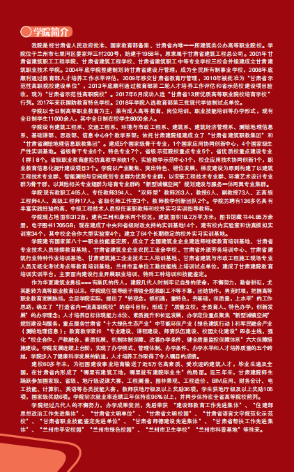 我院是經(jīng)甘肅省人民政府批準(zhǔn)、國(guó)家教育部備案、甘肅省內(nèi)唯一一所建筑類公辦高等職業(yè)院校。學(xué)院位于蘭州市七里河區(qū)晏家坪三村200號(hào),始建于1958年,原隸屬于甘肅省建筑工程總公司。2001年甘肅省建筑職工工程學(xué)院、甘肅省建筑工程學(xué)校、甘肅省建筑職工中等專業(yè)學(xué)校三校合并組建成立甘肅建筑職業(yè)技術(shù)學(xué)院。2004年底學(xué)院整建制劃轉(zhuǎn)甘肅省建設(shè)廳管理,成為全民所有制事業(yè)學(xué)校,2008年底順利通過(guò)教育部人才培養(yǎng)工作水平評(píng)估,2009年移交甘肅省教育廳管理,2010年被批準(zhǔn)為“甘肅省示范性高職院校建設(shè)單位”,2013年底順利通過(guò)教育部第二輪人才培養(yǎng)工作評(píng)估和省示范校建設(shè)項(xiàng)目驗(yàn)收,現(xiàn)為“甘肅省示范性高職院校”。2017年6月成功入選“甘肅省13所優(yōu)質(zhì)高等職業(yè)院校培育學(xué)!毙辛。2017年榮獲國(guó)防教育特色學(xué)校。2018年學(xué)院入選教育部第三批現(xiàn)代學(xué)徒制試點(diǎn)單位。